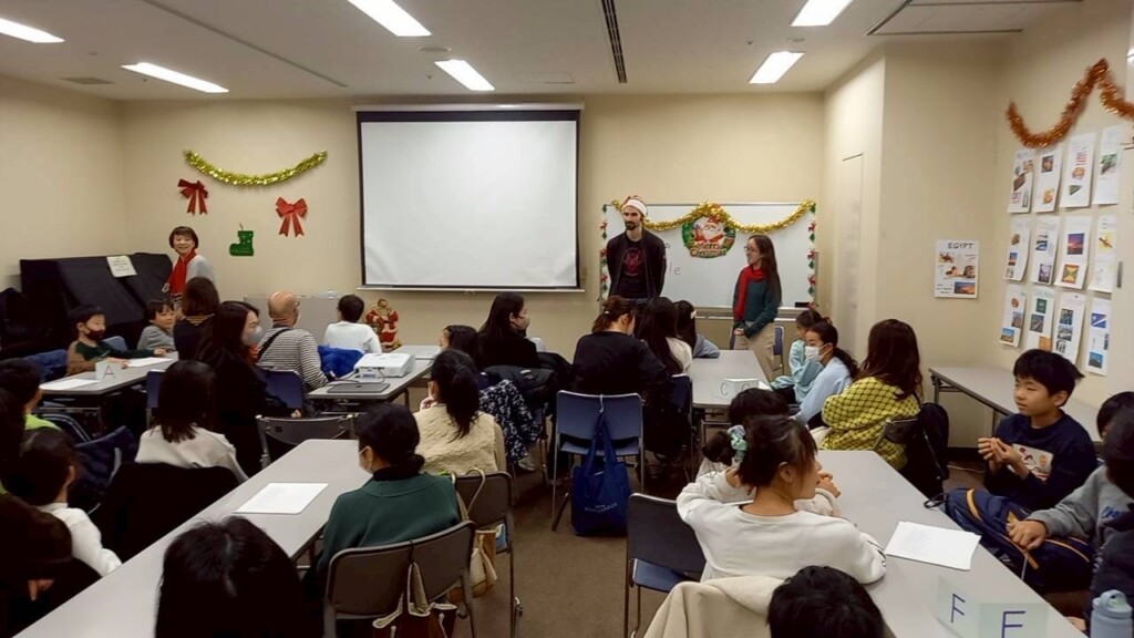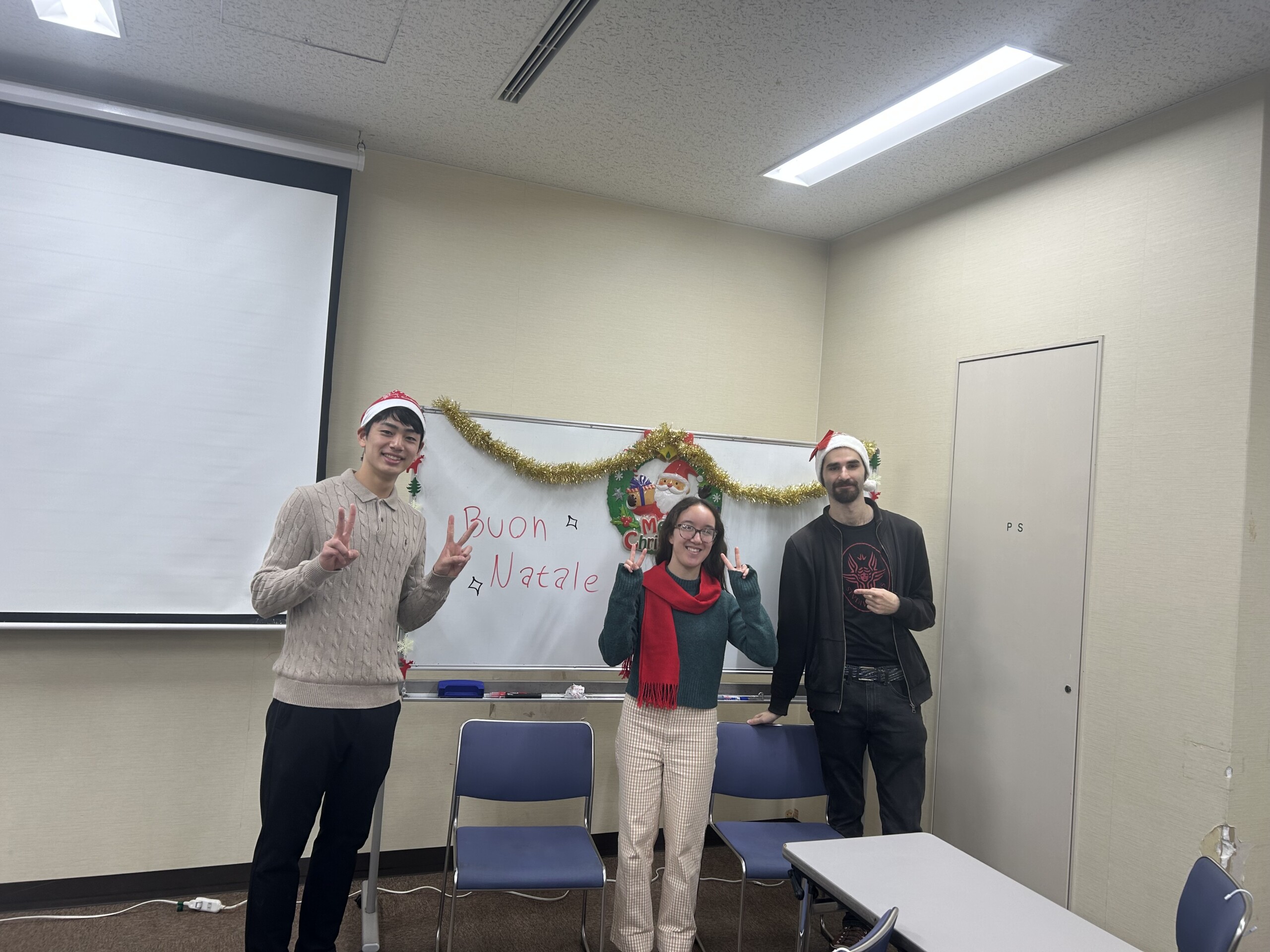 立命館大学の留学生(アメリカ出身のジュリアさん、イタリア出身のアレッサンドロさん)のお二人を招いて、クリスマスパーティーを催しました。 スピーチプロジェクトの発表や、英語の歌の披露など、充実した時間を過ごしました。